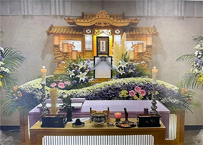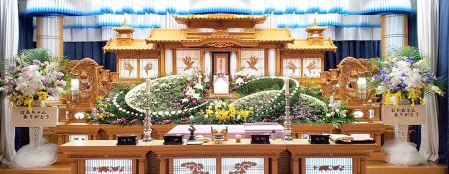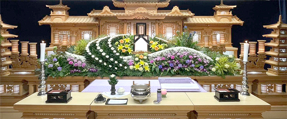 生花付花壇 お棺 骨壷 手続き代行 門前飾り マイクロバス送迎 お茶 おしぼり 自宅用後檀飾り キャリー布団 焼香用具 記録帳類 寝具貸出 放葬具 位牌 食べ物・飲み物持ち込み料 無料 大駐車場